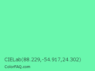 CIELab 88.229,-54.917,24.302 Color is a light green color and the nearest color is Medium Aquamarine #66ddaa. Hex code #69f7ad and RGB value is rgb(105,247,173). In RGB color space, this color is composed of 41% red, 97% green, 68% blue, In CMYK color space, this color is composed of 57% cyan, 0% magenta, 30% yellow , 3% black , In HSL color space, this color has a hue angle of 149° , 90% saturation and 69% lightness.