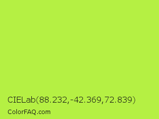 CIELab 88.232,-42.369,72.839 Color is a normal green color and the nearest color is Green Lizard #a7f432. Hex code #b5f043 and RGB value is rgb(181,240,67). In RGB color space, this color is composed of 71% red, 94% green, 26% blue, In CMYK color space, this color is composed of 25% cyan, 0% magenta, 72% yellow , 6% black , In HSL color space, this color has a hue angle of 80° , 85% saturation and 60% lightness.