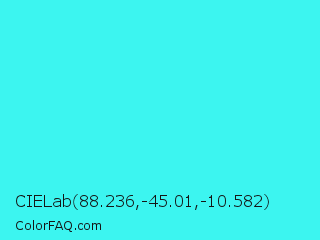 CIELab 88.236,-45.01,-10.582 Color is a normal cyan color and the nearest color is Turquoise #40e0d0. Hex code #3cf5f0 and RGB value is rgb(60,245,240). In RGB color space, this color is composed of 24% red, 96% green, 94% blue, In CMYK color space, this color is composed of 76% cyan, 0% magenta, 2% yellow , 4% black , In HSL color space, this color has a hue angle of 178° , 90% saturation and 60% lightness.