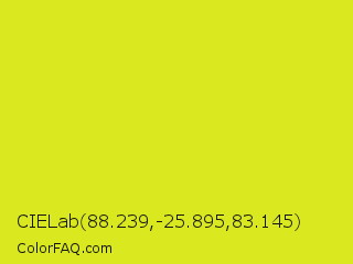 CIELab 88.239,-25.895,83.145 Color is a normal yellow color and the nearest color is Piss Yellow #e1e115. Hex code #d9e81f and RGB value is rgb(217,232,31). In RGB color space, this color is composed of 85% red, 91% green, 12% blue, In CMYK color space, this color is composed of 6% cyan, 0% magenta, 87% yellow , 9% black , In HSL color space, this color has a hue angle of 64° , 81% saturation and 52% lightness.