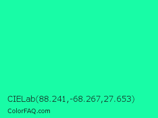CIELab 88.241,-68.267,27.653 Color is a normal green color and the nearest color is Medium Spring Green #00fa9a. Hex code #18fca6 and RGB value is rgb(24,252,166). In RGB color space, this color is composed of 9% red, 99% green, 65% blue, In CMYK color space, this color is composed of 90% cyan, 0% magenta, 34% yellow , 1% black , In HSL color space, this color has a hue angle of 157° , 97% saturation and 54% lightness.