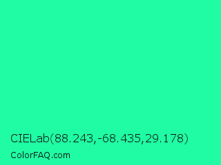 CIELab 88.243,-68.435,29.178 Color is a normal green color and the nearest color is Medium Spring Green #00fa9a. Hex code #20fca3 and RGB value is rgb(32,252,163). In RGB color space, this color is composed of 13% red, 99% green, 64% blue, In CMYK color space, this color is composed of 87% cyan, 0% magenta, 35% yellow , 1% black , In HSL color space, this color has a hue angle of 156° , 97% saturation and 56% lightness.