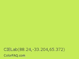 CIELab 88.24,-33.204,65.372 Color is a light lime color and the nearest color is Inchworm #b2ec5d. Hex code #c5ec58 and RGB value is rgb(197,236,88). In RGB color space, this color is composed of 77% red, 93% green, 35% blue, In CMYK color space, this color is composed of 17% cyan, 0% magenta, 63% yellow , 7% black , In HSL color space, this color has a hue angle of 76° , 80% saturation and 64% lightness.