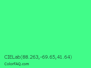 CIELab 88.263,-69.65,41.64 Color is a light green color and the nearest color is Very Light Malachite Green #64e986. Hex code #42fc8a and RGB value is rgb(66,252,138). In RGB color space, this color is composed of 26% red, 99% green, 54% blue, In CMYK color space, this color is composed of 74% cyan, 0% magenta, 45% yellow , 1% black , In HSL color space, this color has a hue angle of 143° , 97% saturation and 62% lightness.