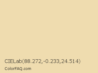 CIELab 88.272,-0.233,24.514 Color is a very light orange color and the nearest color is Chamois #eddcb1. Hex code #efdcaf and RGB value is rgb(239,220,175). In RGB color space, this color is composed of 94% red, 86% green, 69% blue, In CMYK color space, this color is composed of 0% cyan, 8% magenta, 27% yellow , 6% black , In HSL color space, this color has a hue angle of 42° , 67% saturation and 81% lightness.