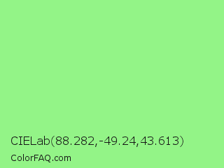 CIELab 88.282,-49.24,43.613 Color is a light green color and the nearest color is Light Green #90ee90. Hex code #93f487 and RGB value is rgb(147,244,135). In RGB color space, this color is composed of 58% red, 96% green, 53% blue, In CMYK color space, this color is composed of 40% cyan, 0% magenta, 45% yellow , 4% black , In HSL color space, this color has a hue angle of 113° , 83% saturation and 74% lightness.
