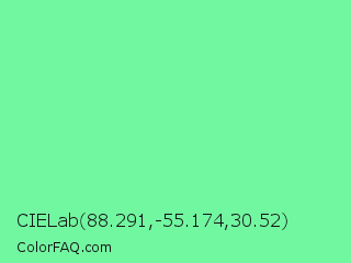 CIELab 88.291,-55.174,30.52 Color is a light green color and the nearest color is Medium Aquamarine #66ddaa. Hex code #72f7a1 and RGB value is rgb(114,247,161). In RGB color space, this color is composed of 45% red, 97% green, 63% blue, In CMYK color space, this color is composed of 54% cyan, 0% magenta, 35% yellow , 3% black , In HSL color space, this color has a hue angle of 141° , 89% saturation and 71% lightness.