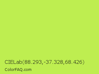 CIELab 88.293,-37.328,68.426 Color is a light lime color and the nearest color is Inchworm #b2ec5d. Hex code #beee50 and RGB value is rgb(190,238,80). In RGB color space, this color is composed of 75% red, 93% green, 31% blue, In CMYK color space, this color is composed of 20% cyan, 0% magenta, 66% yellow , 7% black , In HSL color space, this color has a hue angle of 78° , 82% saturation and 62% lightness.