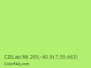 CIELab 88.293,-40.917,55.663 Color is a light green color and the nearest color is Inchworm #b2ec5d. Hex code #b0f06e and RGB value is rgb(176,240,110). In RGB color space, this color is composed of 69% red, 94% green, 43% blue, In CMYK color space, this color is composed of 27% cyan, 0% magenta, 54% yellow , 6% black , In HSL color space, this color has a hue angle of 90° , 81% saturation and 69% lightness.