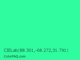 CIELab 88.301,-68.272,31.791 Color is a normal green color and the nearest color is Eucalyptus #44d7a8. Hex code #2ffc9e and RGB value is rgb(47,252,158). In RGB color space, this color is composed of 18% red, 99% green, 62% blue, In CMYK color space, this color is composed of 81% cyan, 0% magenta, 37% yellow , 1% black , In HSL color space, this color has a hue angle of 152° , 97% saturation and 59% lightness.