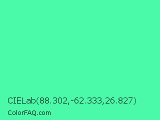 CIELab 88.302,-62.333,26.827 Color is a light green color and the nearest color is Eucalyptus #44d7a8. Hex code #4bfaa8 and RGB value is rgb(75,250,168). In RGB color space, this color is composed of 29% red, 98% green, 66% blue, In CMYK color space, this color is composed of 70% cyan, 0% magenta, 33% yellow , 2% black , In HSL color space, this color has a hue angle of 152° , 95% saturation and 64% lightness.
