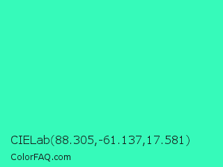 CIELab 88.305,-61.137,17.581 Color is a normal green color and the nearest color is Turquoise #40e0d0. Hex code #36faba and RGB value is rgb(54,250,186). In RGB color space, this color is composed of 21% red, 98% green, 73% blue, In CMYK color space, this color is composed of 78% cyan, 0% magenta, 26% yellow , 2% black , In HSL color space, this color has a hue angle of 160° , 95% saturation and 60% lightness.