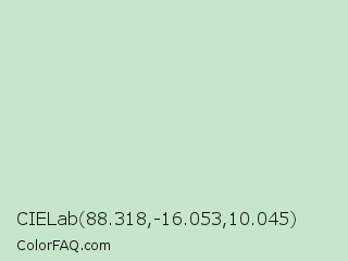 CIELab 88.318,-16.053,10.045 Color is a very light green color and the nearest color is Sea Mist #c5dbca. Hex code #c5e6ca and RGB value is rgb(197,230,202). In RGB color space, this color is composed of 77% red, 90% green, 79% blue, In CMYK color space, this color is composed of 14% cyan, 0% magenta, 12% yellow , 10% black , In HSL color space, this color has a hue angle of 129° , 40% saturation and 84% lightness.