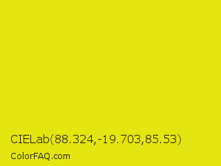 CIELab 88.324,-19.703,85.53 Color is a normal yellow color and the nearest color is Piss Yellow #e1e115. Hex code #e5e512 and RGB value is rgb(229,229,18). In RGB color space, this color is composed of 90% red, 90% green, 7% blue, In CMYK color space, this color is composed of 0% cyan, 0% magenta, 92% yellow , 10% black , In HSL color space, this color has a hue angle of 60° , 85% saturation and 48% lightness.