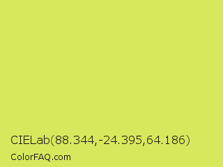 CIELab 88.344,-24.395,64.186 Color is a light yellow color and the nearest color is Maximum Green Yellow #d9e650. Hex code #d6e85c and RGB value is rgb(214,232,92). In RGB color space, this color is composed of 84% red, 91% green, 36% blue, In CMYK color space, this color is composed of 8% cyan, 0% magenta, 60% yellow , 9% black , In HSL color space, this color has a hue angle of 68° , 75% saturation and 64% lightness.