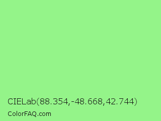 CIELab 88.354,-48.668,42.744 Color is a light green color and the nearest color is Light Green #90ee90. Hex code #94f489 and RGB value is rgb(148,244,137). In RGB color space, this color is composed of 58% red, 96% green, 54% blue, In CMYK color space, this color is composed of 39% cyan, 0% magenta, 44% yellow , 4% black , In HSL color space, this color has a hue angle of 114° , 83% saturation and 75% lightness.