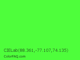CIELab 88.361,-77.107,74.135 Color is a light green color and the nearest color is Neon Green #39ff14. Hex code #4efe3b and RGB value is rgb(78,254,59). In RGB color space, this color is composed of 31% red, 100% green, 23% blue, In CMYK color space, this color is composed of 69% cyan, 0% magenta, 77% yellow , 0% black , In HSL color space, this color has a hue angle of 114° , 99% saturation and 61% lightness.