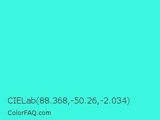 CIELab 88.368,-50.26,-2.034 Color is a normal cyan color and the nearest color is Turquoise #40e0d0. Hex code #3bf7e0 and RGB value is rgb(59,247,224). In RGB color space, this color is composed of 23% red, 97% green, 88% blue, In CMYK color space, this color is composed of 76% cyan, 0% magenta, 9% yellow , 3% black , In HSL color space, this color has a hue angle of 173° , 92% saturation and 60% lightness.