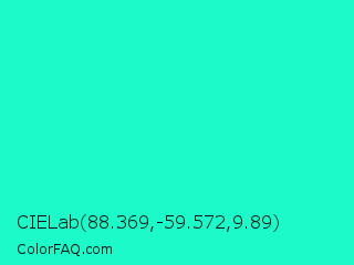 CIELab 88.369,-59.572,9.89 Color is a normal cyan color and the nearest color is Bright Turquoise #08e8de. Hex code #1cfac9 and RGB value is rgb(28,250,201). In RGB color space, this color is composed of 11% red, 98% green, 79% blue, In CMYK color space, this color is composed of 89% cyan, 0% magenta, 20% yellow , 2% black , In HSL color space, this color has a hue angle of 167° , 96% saturation and 55% lightness.