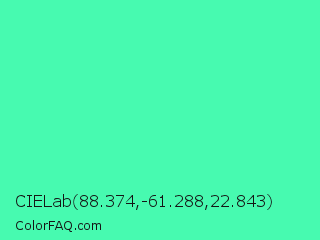 CIELab 88.374,-61.288,22.843 Color is a light green color and the nearest color is Eucalyptus #44d7a8. Hex code #47fab0 and RGB value is rgb(71,250,176). In RGB color space, this color is composed of 28% red, 98% green, 69% blue, In CMYK color space, this color is composed of 72% cyan, 0% magenta, 30% yellow , 2% black , In HSL color space, this color has a hue angle of 155° , 95% saturation and 63% lightness.