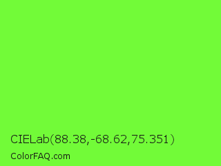 CIELab 88.38,-68.62,75.351 Color is a normal green color and the nearest color is Spring Frost #87ff2a. Hex code #72fb38 and RGB value is rgb(114,251,56). In RGB color space, this color is composed of 45% red, 98% green, 22% blue, In CMYK color space, this color is composed of 55% cyan, 0% magenta, 78% yellow , 2% black , In HSL color space, this color has a hue angle of 102° , 96% saturation and 60% lightness.