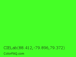 CIELab 88.412,-79.896,79.372 Color is a normal green color and the nearest color is Neon Green #39ff14. Hex code #45ff26 and RGB value is rgb(69,255,38). In RGB color space, this color is composed of 27% red, 100% green, 15% blue, In CMYK color space, this color is composed of 73% cyan, 0% magenta, 85% yellow , 0% black , In HSL color space, this color has a hue angle of 111° , 100% saturation and 57% lightness.