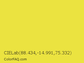 CIELab 88.434,-14.991,75.332 Color is a normal yellow color and the nearest color is Sandstorm #ecd540. Hex code #ebe340 and RGB value is rgb(235,227,64). In RGB color space, this color is composed of 92% red, 89% green, 25% blue, In CMYK color space, this color is composed of 0% cyan, 3% magenta, 73% yellow , 8% black , In HSL color space, this color has a hue angle of 57° , 81% saturation and 59% lightness.