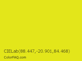 CIELab 88.447,-20.901,84.468 Color is a normal yellow color and the nearest color is Piss Yellow #e1e115. Hex code #e3e61a and RGB value is rgb(227,230,26). In RGB color space, this color is composed of 89% red, 90% green, 10% blue, In CMYK color space, this color is composed of 1% cyan, 0% magenta, 89% yellow , 10% black , In HSL color space, this color has a hue angle of 61° , 80% saturation and 50% lightness.