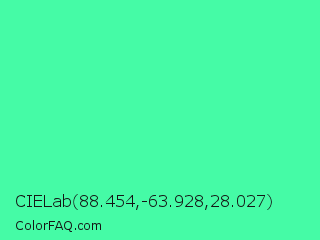 CIELab 88.454,-63.928,28.027 Color is a light green color and the nearest color is Eucalyptus #44d7a8. Hex code #45fba6 and RGB value is rgb(69,251,166). In RGB color space, this color is composed of 27% red, 98% green, 65% blue, In CMYK color space, this color is composed of 73% cyan, 0% magenta, 34% yellow , 2% black , In HSL color space, this color has a hue angle of 152° , 96% saturation and 63% lightness.