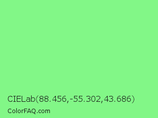 CIELab 88.456,-55.302,43.686 Color is a light green color and the nearest color is Light Green #90ee90. Hex code #82f787 and RGB value is rgb(130,247,135). In RGB color space, this color is composed of 51% red, 97% green, 53% blue, In CMYK color space, this color is composed of 47% cyan, 0% magenta, 45% yellow , 3% black , In HSL color space, this color has a hue angle of 123° , 88% saturation and 74% lightness.