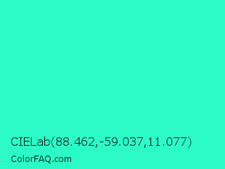 CIELab 88.462,-59.037,11.077 Color is a normal cyan color and the nearest color is Turquoise #40e0d0. Hex code #2cfac7 and RGB value is rgb(44,250,199). In RGB color space, this color is composed of 17% red, 98% green, 78% blue, In CMYK color space, this color is composed of 82% cyan, 0% magenta, 20% yellow , 2% black , In HSL color space, this color has a hue angle of 165° , 95% saturation and 58% lightness.