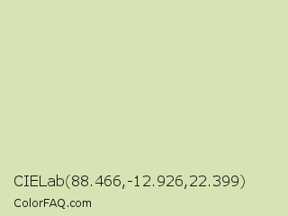 CIELab 88.466,-12.926,22.399 Color is a light lime color and the nearest color is Caper #dcedb4. Hex code #d6e4b3 and RGB value is rgb(214,228,179). In RGB color space, this color is composed of 84% red, 89% green, 70% blue, In CMYK color space, this color is composed of 6% cyan, 0% magenta, 21% yellow , 11% black , In HSL color space, this color has a hue angle of 77° , 48% saturation and 80% lightness.