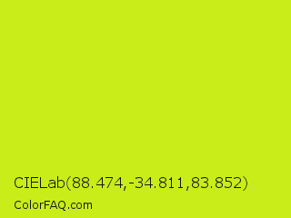 CIELab 88.474,-34.811,83.852 Color is a normal yellow color and the nearest color is Las Palmas #c6e610. Hex code #c9ed19 and RGB value is rgb(201,237,25). In RGB color space, this color is composed of 79% red, 93% green, 10% blue, In CMYK color space, this color is composed of 15% cyan, 0% magenta, 89% yellow , 7% black , In HSL color space, this color has a hue angle of 70° , 85% saturation and 51% lightness.