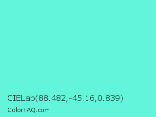 CIELab 88.482,-45.16,0.839 Color is a light cyan color and the nearest color is Aquamarine #7fffd4. Hex code #63f5db and RGB value is rgb(99,245,219). In RGB color space, this color is composed of 39% red, 96% green, 86% blue, In CMYK color space, this color is composed of 60% cyan, 0% magenta, 11% yellow , 4% black , In HSL color space, this color has a hue angle of 169° , 88% saturation and 67% lightness.