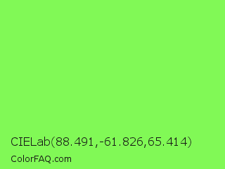 CIELab 88.491,-61.826,65.414 Color is a light green color and the nearest color is Screamin Green #66ff66. Hex code #81f956 and RGB value is rgb(129,249,86). In RGB color space, this color is composed of 51% red, 98% green, 34% blue, In CMYK color space, this color is composed of 48% cyan, 0% magenta, 65% yellow , 2% black , In HSL color space, this color has a hue angle of 104° , 93% saturation and 66% lightness.