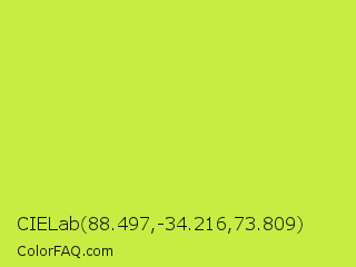 CIELab 88.497,-34.216,73.809 Color is a normal lime color and the nearest color is Pear #d1e231. Hex code #c7ed42 and RGB value is rgb(199,237,66). In RGB color space, this color is composed of 78% red, 93% green, 26% blue, In CMYK color space, this color is composed of 16% cyan, 0% magenta, 72% yellow , 7% black , In HSL color space, this color has a hue angle of 73° , 83% saturation and 59% lightness.