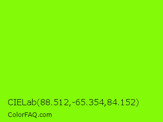 CIELab 88.512,-65.354,84.152 Color is a normal green color and the nearest color is Chartreuse #7fff00. Hex code #82fa08 and RGB value is rgb(130,250,8). In RGB color space, this color is composed of 51% red, 98% green, 3% blue, In CMYK color space, this color is composed of 48% cyan, 0% magenta, 97% yellow , 2% black , In HSL color space, this color has a hue angle of 90° , 96% saturation and 51% lightness.