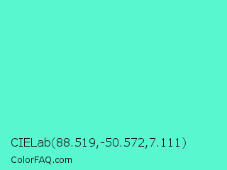CIELab 88.519,-50.572,7.111 Color is a light cyan color and the nearest color is Turquoise #40e0d0. Hex code #59f7cf and RGB value is rgb(89,247,207). In RGB color space, this color is composed of 35% red, 97% green, 81% blue, In CMYK color space, this color is composed of 64% cyan, 0% magenta, 16% yellow , 3% black , In HSL color space, this color has a hue angle of 165° , 91% saturation and 66% lightness.