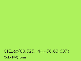 CIELab 88.525,-44.456,63.637 Color is a light green color and the nearest color is Inchworm #b2ec5d. Hex code #adf25c and RGB value is rgb(173,242,92). In RGB color space, this color is composed of 68% red, 95% green, 36% blue, In CMYK color space, this color is composed of 29% cyan, 0% magenta, 62% yellow , 5% black , In HSL color space, this color has a hue angle of 88° , 85% saturation and 65% lightness.