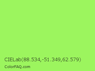 CIELab 88.534,-51.349,62.579 Color is a light green color and the nearest color is Inchworm #b2ec5d. Hex code #9cf55e and RGB value is rgb(156,245,94). In RGB color space, this color is composed of 61% red, 96% green, 37% blue, In CMYK color space, this color is composed of 36% cyan, 0% magenta, 62% yellow , 4% black , In HSL color space, this color has a hue angle of 95° , 88% saturation and 66% lightness.