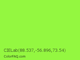 CIELab 88.537,-56.896,73.54 Color is a light green color and the nearest color is French Lime #9efd38. Hex code #94f740 and RGB value is rgb(148,247,64). In RGB color space, this color is composed of 58% red, 97% green, 25% blue, In CMYK color space, this color is composed of 40% cyan, 0% magenta, 74% yellow , 3% black , In HSL color space, this color has a hue angle of 92° , 92% saturation and 61% lightness.