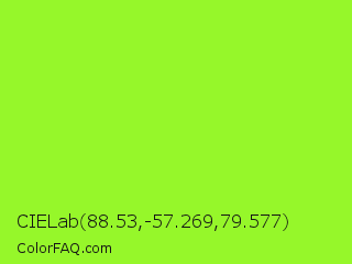 CIELab 88.53,-57.269,79.577 Color is a normal green color and the nearest color is Spring Frost #87ff2a. Hex code #96f72a and RGB value is rgb(150,247,42). In RGB color space, this color is composed of 59% red, 97% green, 16% blue, In CMYK color space, this color is composed of 39% cyan, 0% magenta, 83% yellow , 3% black , In HSL color space, this color has a hue angle of 88° , 93% saturation and 57% lightness.
