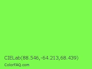 CIELab 88.546,-64.213,68.439 Color is a light green color and the nearest color is Kiwi #8ee53f. Hex code #7cfa4e and RGB value is rgb(124,250,78). In RGB color space, this color is composed of 49% red, 98% green, 31% blue, In CMYK color space, this color is composed of 50% cyan, 0% magenta, 69% yellow , 2% black , In HSL color space, this color has a hue angle of 104° , 95% saturation and 64% lightness.