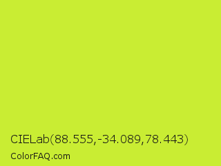 CIELab 88.555,-34.089,78.443 Color is a normal lime color and the nearest color is Pear #d1e231. Hex code #c9ed33 and RGB value is rgb(201,237,51). In RGB color space, this color is composed of 79% red, 93% green, 20% blue, In CMYK color space, this color is composed of 15% cyan, 0% magenta, 78% yellow , 7% black , In HSL color space, this color has a hue angle of 72° , 84% saturation and 56% lightness.