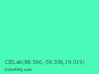 CIELab 88.566,-59.336,19.019 Color is a light green color and the nearest color is Turquoise #40e0d0. Hex code #49fab8 and RGB value is rgb(73,250,184). In RGB color space, this color is composed of 29% red, 98% green, 72% blue, In CMYK color space, this color is composed of 71% cyan, 0% magenta, 26% yellow , 2% black , In HSL color space, this color has a hue angle of 158° , 95% saturation and 63% lightness.