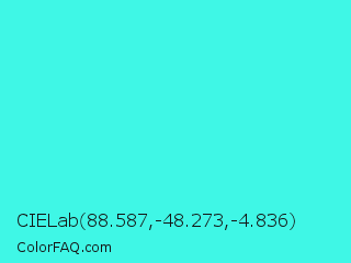 CIELab 88.587,-48.273,-4.836 Color is a light cyan color and the nearest color is Turquoise #40e0d0. Hex code #3ff7e6 and RGB value is rgb(63,247,230). In RGB color space, this color is composed of 25% red, 97% green, 90% blue, In CMYK color space, this color is composed of 74% cyan, 0% magenta, 7% yellow , 3% black , In HSL color space, this color has a hue angle of 174° , 92% saturation and 61% lightness.
