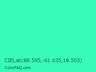 CIELab 88.595,-61.635,18.503 Color is a normal green color and the nearest color is Turquoise #40e0d0. Hex code #37fbb9 and RGB value is rgb(55,251,185). In RGB color space, this color is composed of 22% red, 98% green, 73% blue, In CMYK color space, this color is composed of 78% cyan, 0% magenta, 26% yellow , 2% black , In HSL color space, this color has a hue angle of 160° , 96% saturation and 60% lightness.