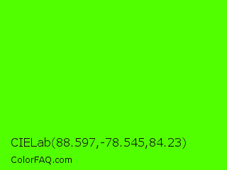 CIELab 88.597,-78.545,84.23 Color is a normal green color and the nearest color is Chlorophyll Green #4aff00. Hex code #52ff00 and RGB value is rgb(82,255,0). In RGB color space, this color is composed of 32% red, 100% green, 0% blue, In CMYK color space, this color is composed of 68% cyan, 0% magenta, 100% yellow , 0% black , In HSL color space, this color has a hue angle of 101° , 100% saturation and 50% lightness.