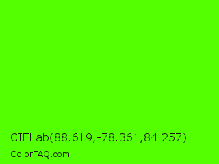 CIELab 88.619,-78.361,84.257 Color is a normal green color and the nearest color is Chlorophyll Green #4aff00. Hex code #53ff00 and RGB value is rgb(83,255,0). In RGB color space, this color is composed of 33% red, 100% green, 0% blue, In CMYK color space, this color is composed of 67% cyan, 0% magenta, 100% yellow , 0% black , In HSL color space, this color has a hue angle of 100° , 100% saturation and 50% lightness.
