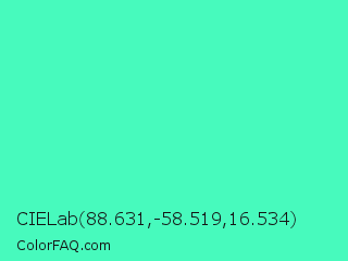 CIELab 88.631,-58.519,16.534 Color is a light green color and the nearest color is Turquoise #40e0d0. Hex code #47fabd and RGB value is rgb(71,250,189). In RGB color space, this color is composed of 28% red, 98% green, 74% blue, In CMYK color space, this color is composed of 72% cyan, 0% magenta, 24% yellow , 2% black , In HSL color space, this color has a hue angle of 160° , 95% saturation and 63% lightness.